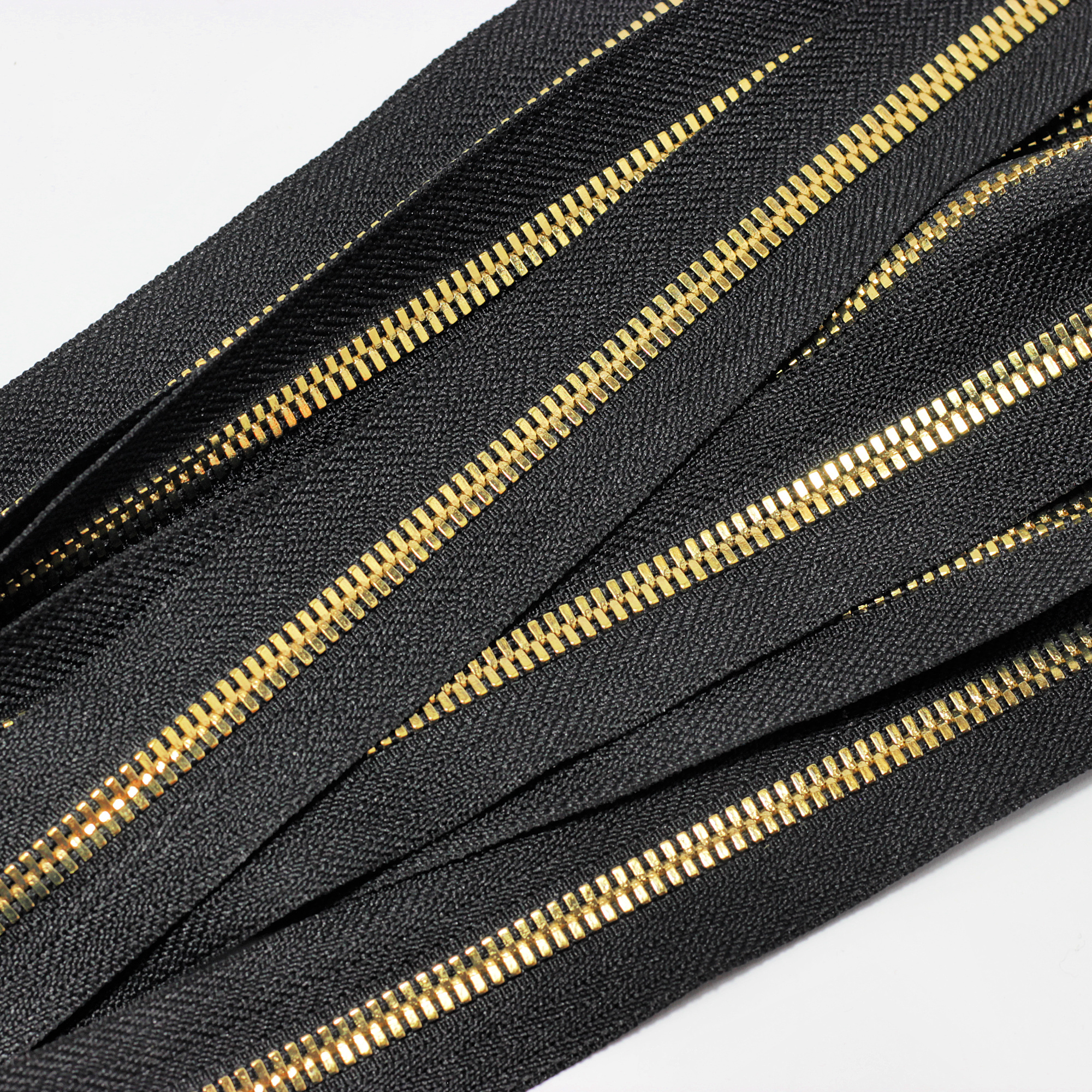 Kiváló minőségű fém cipzár aranyszínű fogakkal, fekete színű cipzárszalaggal. Mérete T5.