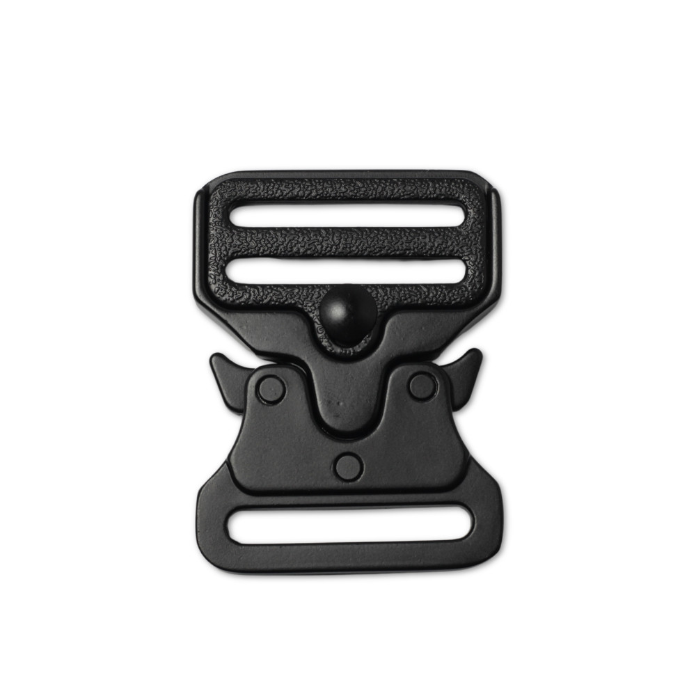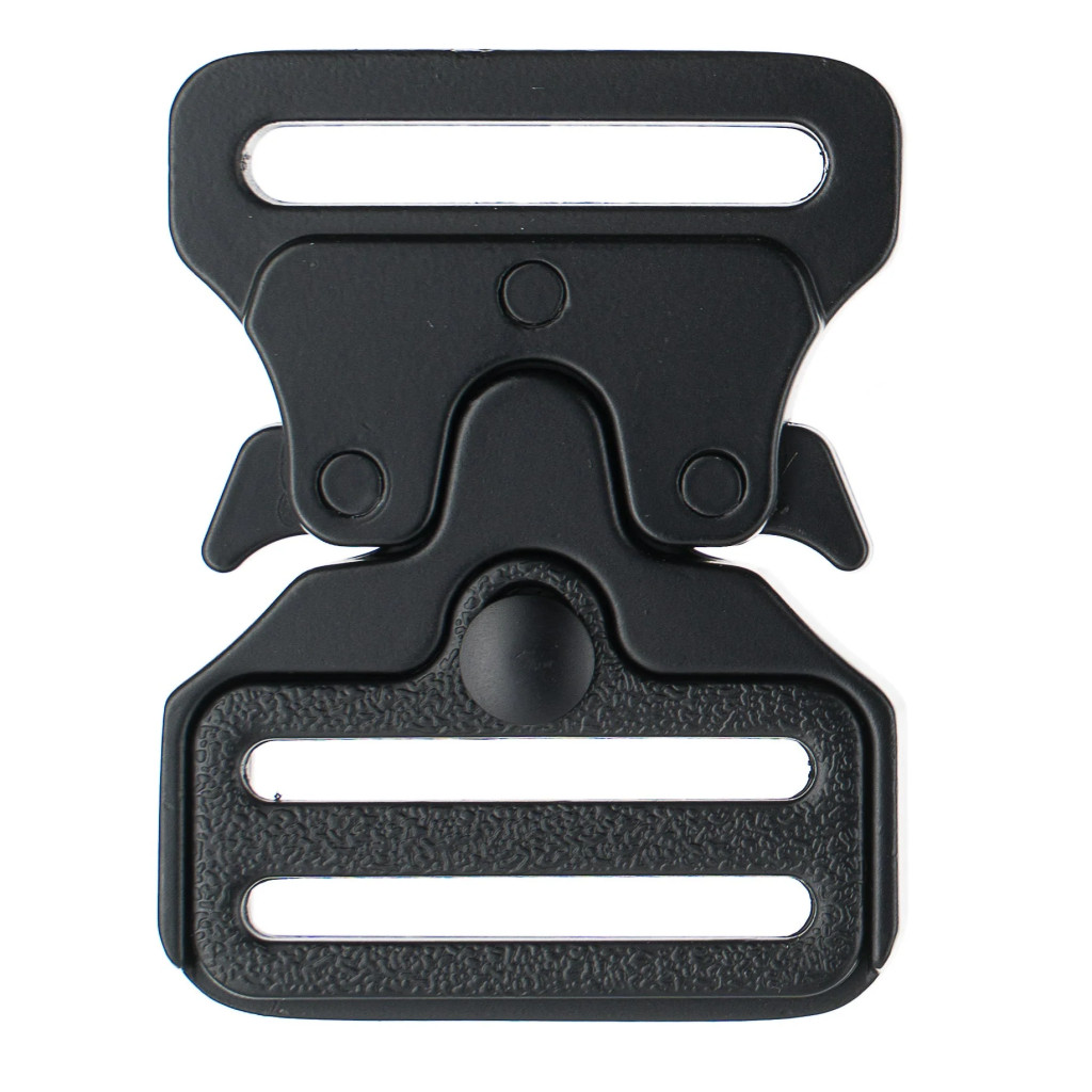 Ez a masszív, professzionális kialakítású fekete fém hevedercsat kiváló választás, ha rendkívül strapabíró, gyors oldású csatra van szükséged. A csat fémrugós záródása két oldalon nyitható, ami egy kézzel is könnyen kezelhető, mégis biztonságosan záródik.