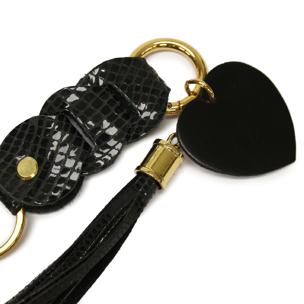 Táskadísz és kulcstartó fekete bőrből, arany kellékekkel
