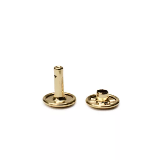 Arany színű dupla fejű szegecs. A fej átmérője 11 mm, láb magassága 10 mm.